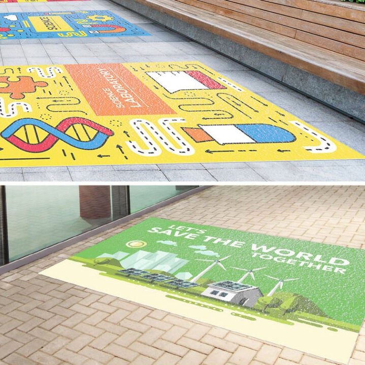 铝箔地板广告贴采用坚固的铝箔材料制成,在粗糙的地面上也可使用,并具有防滑的特性,防水防晒,耐高温,室内室内均可使用。
