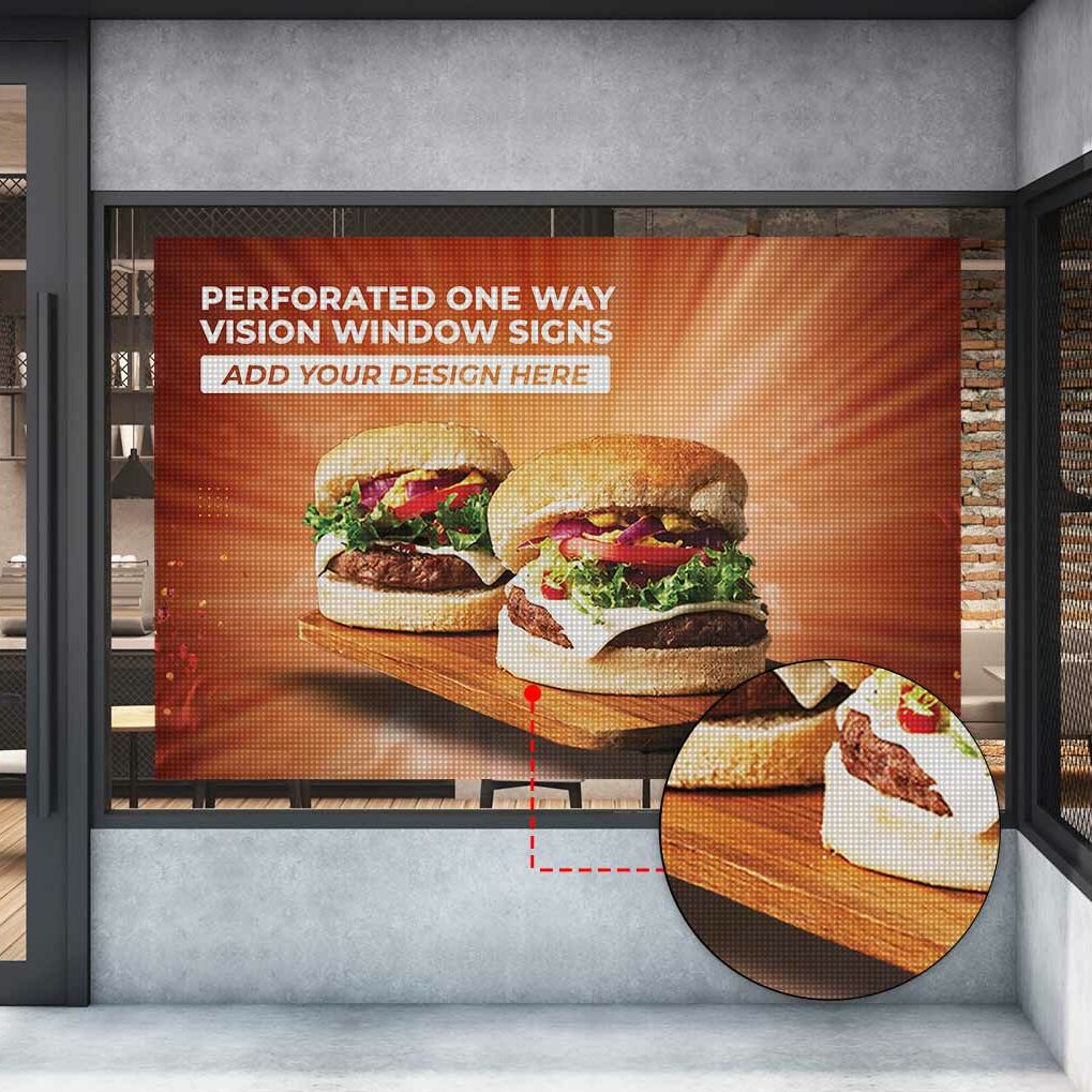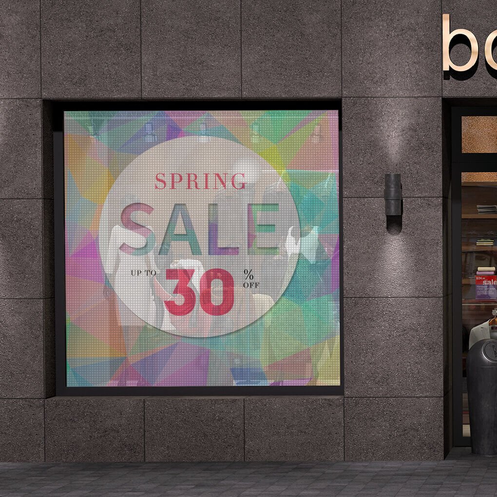 单孔透视玻璃贴,从里面可以看到外面,而从外面看是美观的画面,还能起到遮阳的效果,能贴在店铺的玻璃门窗或是汽车门窗等场景。